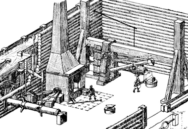 Общий вид молотового амбара. XVII век. Реконструкция Н. Б. Бакланова.